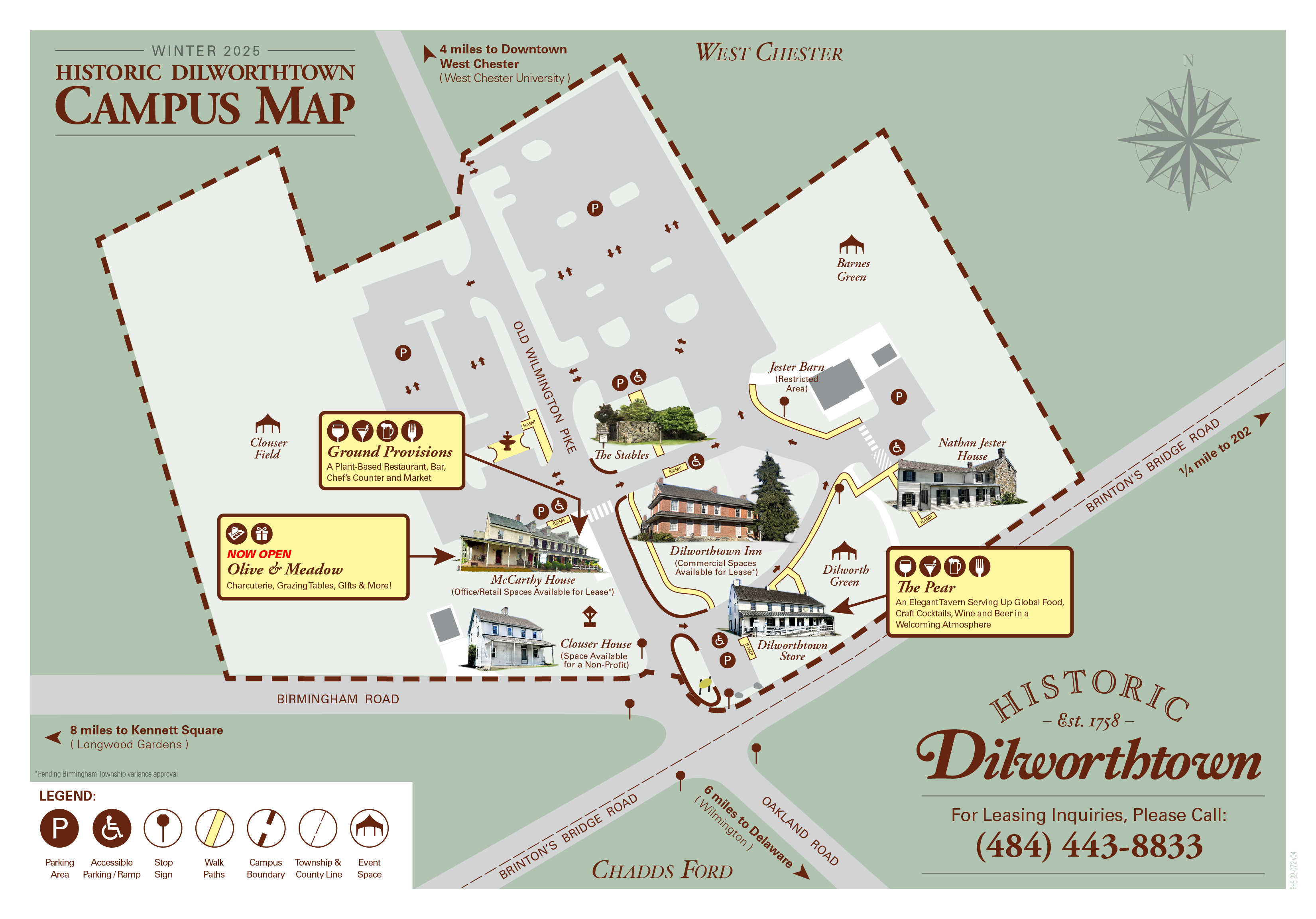 The buildings formerly known as the Dilworthtown Inn, the Blue Pear Bistro, and the Inn Keeper’s Kitchen – and their surrounding outbuildings and property – are under new ownership. Our mission is to utilize the outbuildings to accommodate small business owners that, combined with the restaurants, will create a working and leisure destination for generations to come.